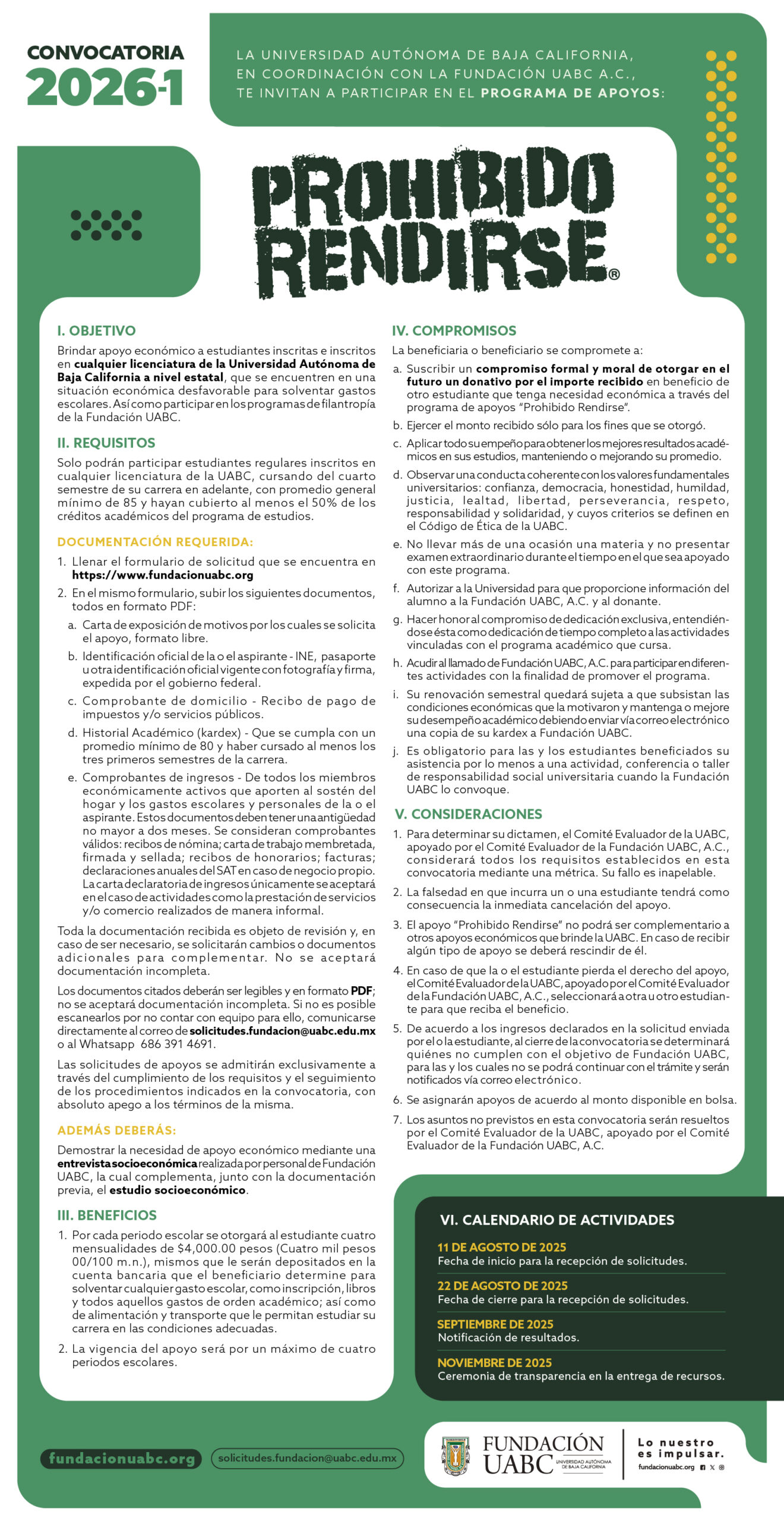 El programa Prohibido Rendirse es un apoyo económico mensual de 4 mil pesos. Este monto se destina a los alumnos de la UABC que estén inscritos en un programa de licenciatura y que se encuentren en una situación económica desfavorable que les impida solventar gastos escolares y de manutención.